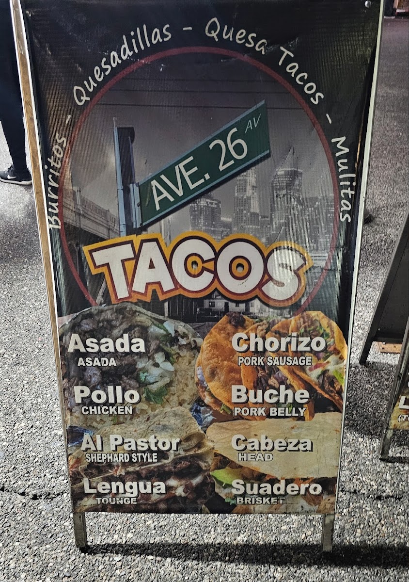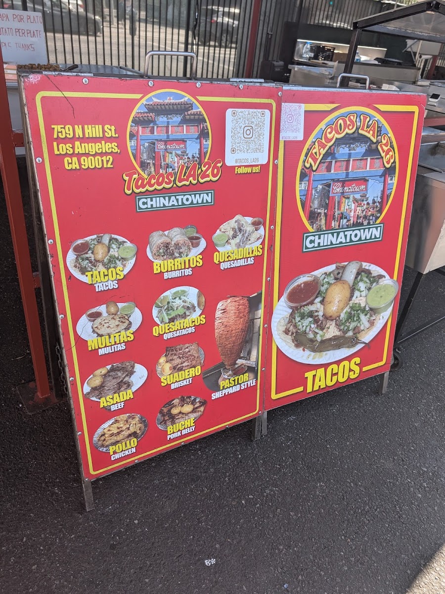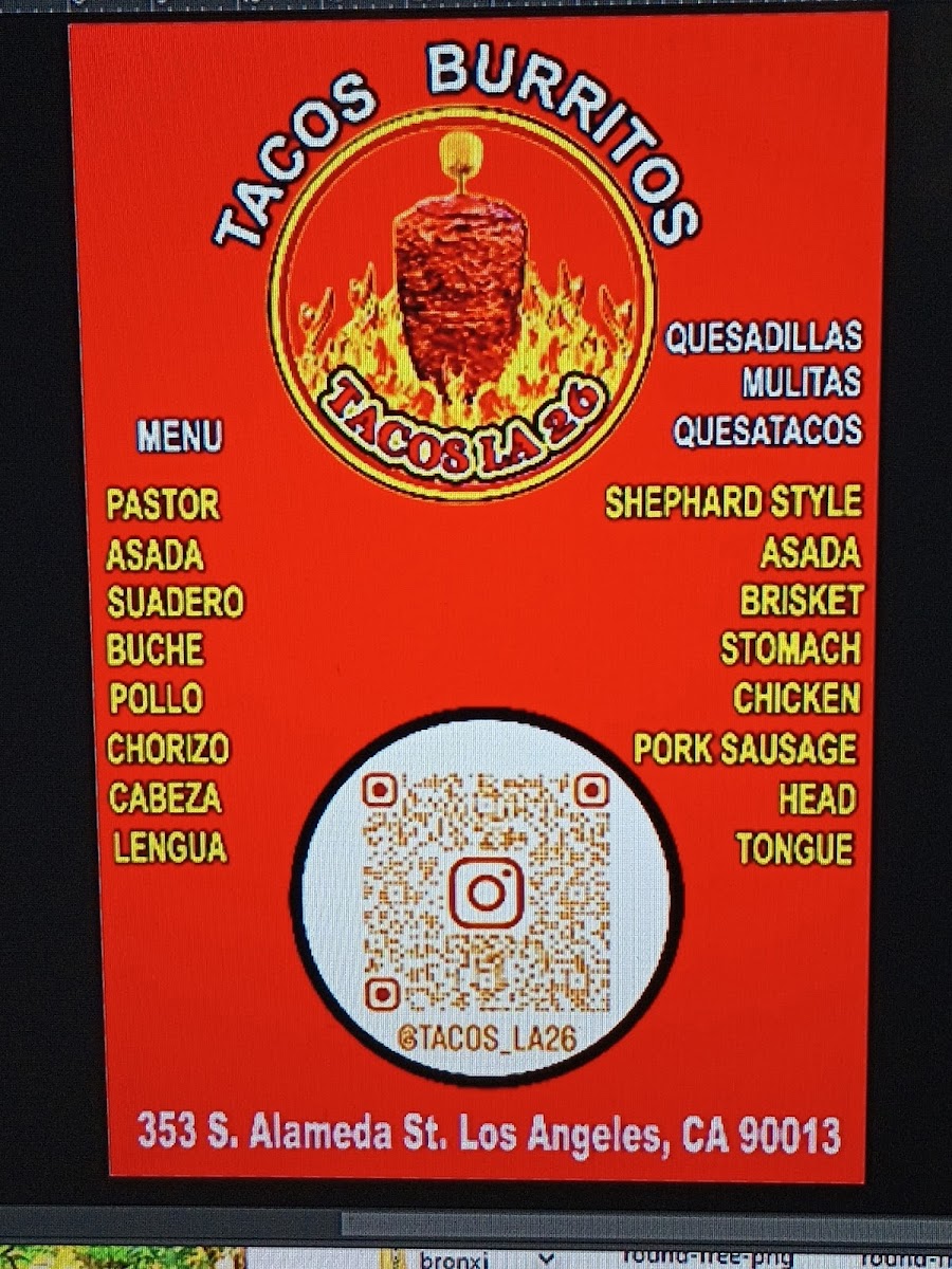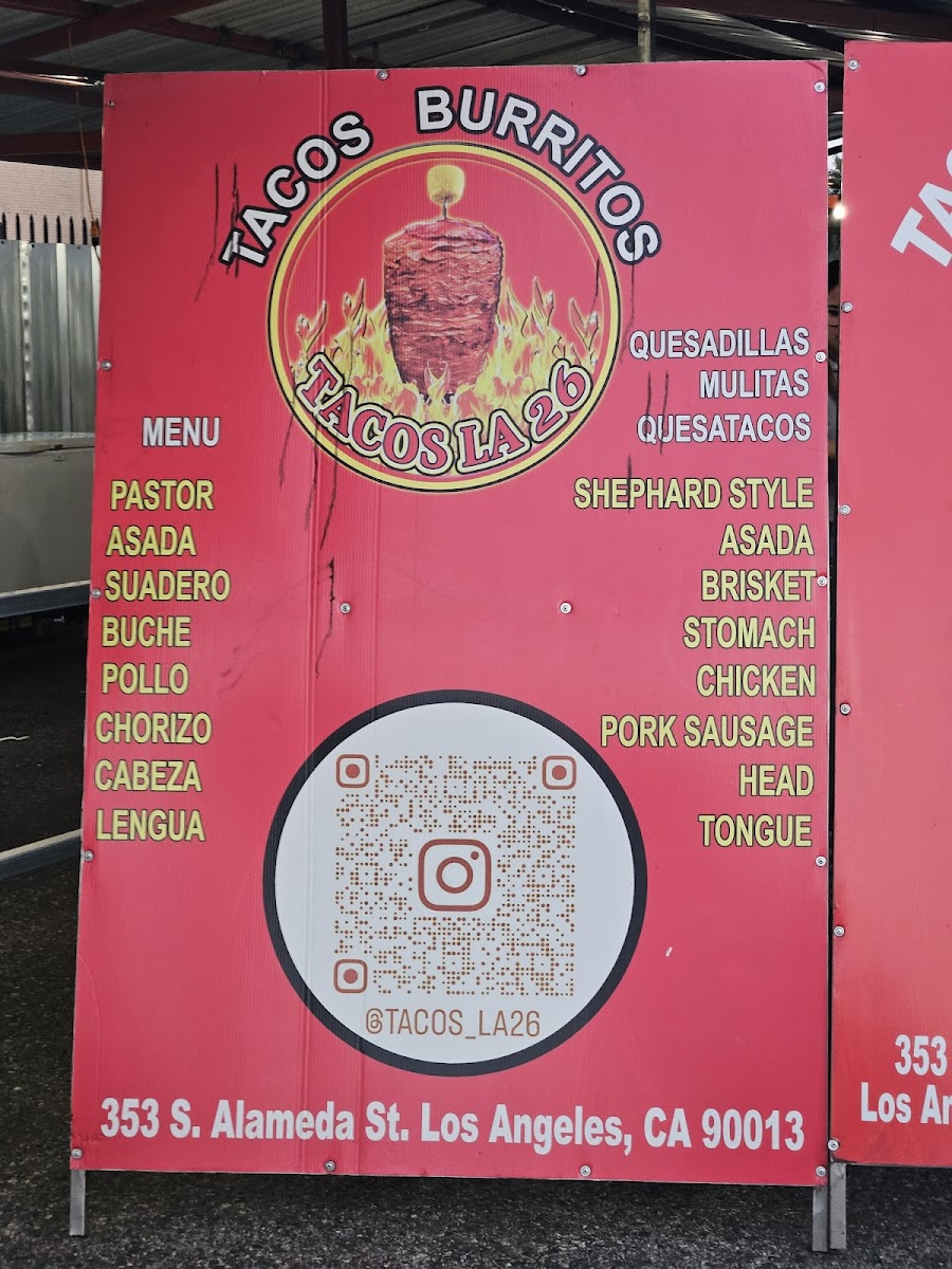 Welcome to Tacos La 26!, formerly known as Ave 26 Tacos, a hidden gem located at 353s Alameda St, Los Angeles. This taco spot brings the vibrant taste of Mexico directly to your plate. The menu is a taco lover's dream, offering an array of meat choices including Taco Asada, Pastor, Suadero, and Chorizo, each available for just $2.25. For those looking for something hearty, the burritos and quesatacos expand the flavor options at very reasonable prices.