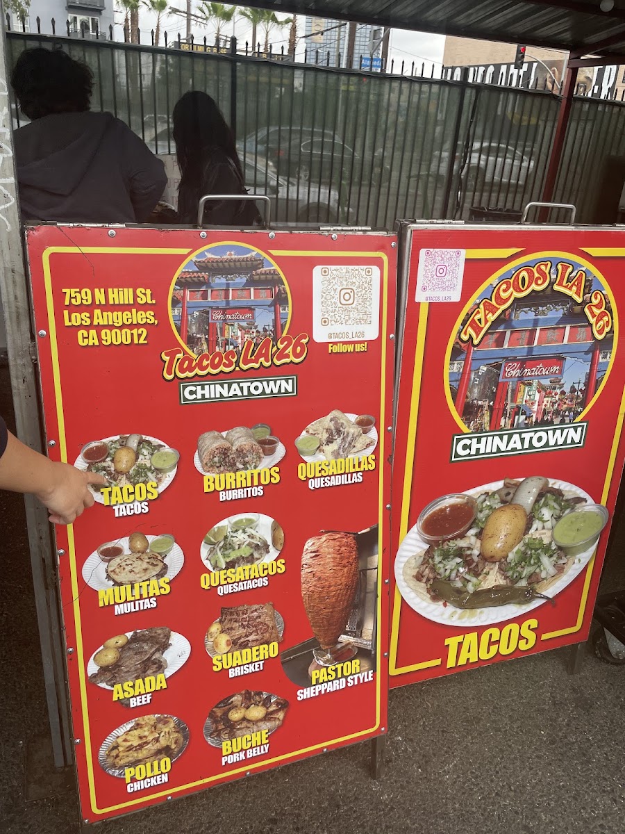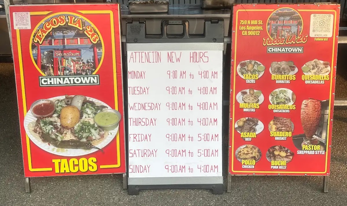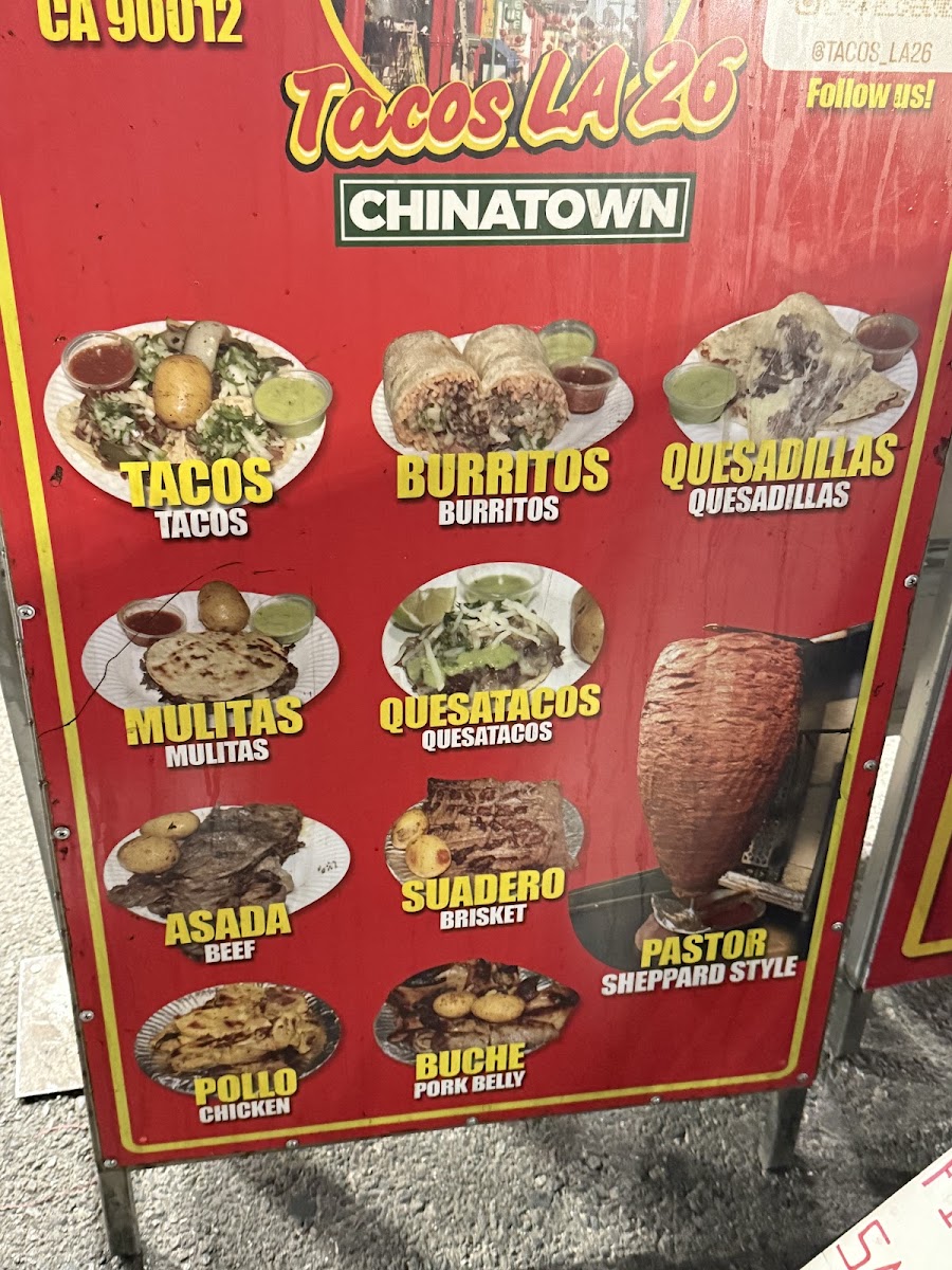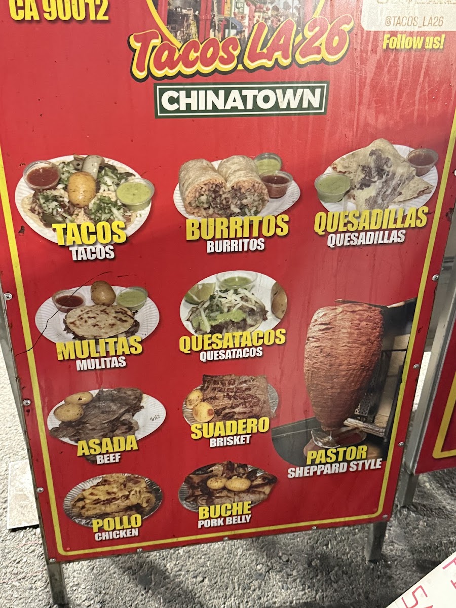 Welcome to Tacos La 26!, formerly known as Ave 26 Tacos, a hidden gem located at 353s Alameda St, Los Angeles. This taco spot brings the vibrant taste of Mexico directly to your plate. The menu is a taco lover's dream, offering an array of meat choices including Taco Asada, Pastor, Suadero, and Chorizo, each available for just $2.25. For those looking for something hearty, the burritos and quesatacos expand the flavor options at very reasonable prices.